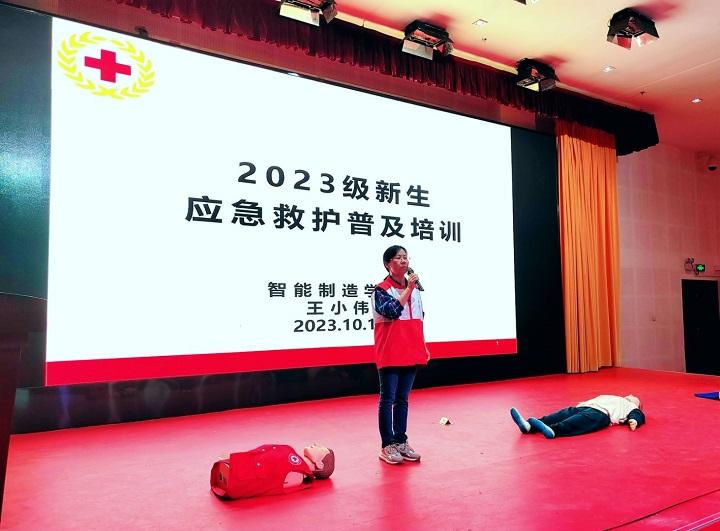 10月12日,智能制造学院开展2023级新生应急救护培训,学生处金杰老师和智能制造学院辅导员王小伟老师作为讲师,2022级学生刘子健、彭钰坤作为志愿者,共同向新生介绍了心肺复苏等应急救护基础知识和基本技能。