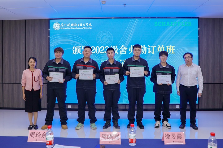 智能制造学院党总支书记周玲余与徐昱晨为学徒颁发录取通知,为舍弗勒班辅导员、专任教师颁发聘书。