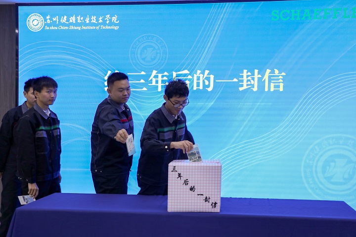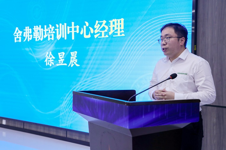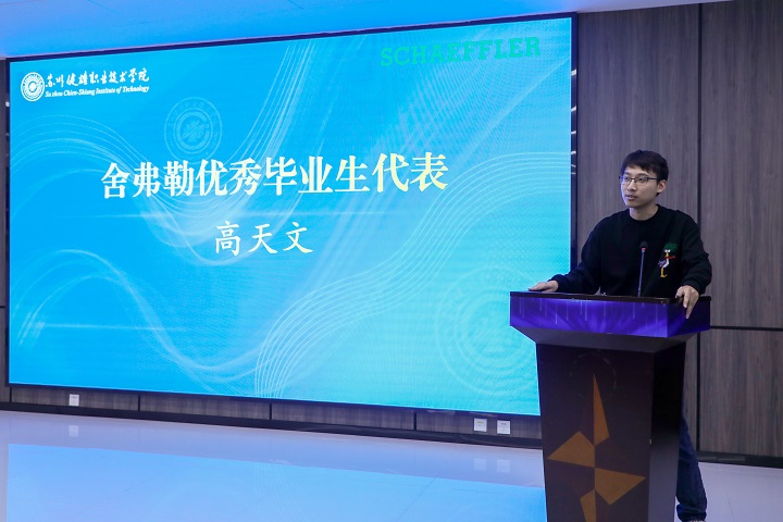 徐昱晨在致辞中感谢学院对舍弗勒双元制学徒项目的重视和支持,与同学们分享了舍弗勒集团的未来发展趋势,企业对未来人才的期待,以及学徒职业发展的可持续性因素,希望同学们保持好奇、持续学习、注重积累,为自身的发展打好结实基础。
