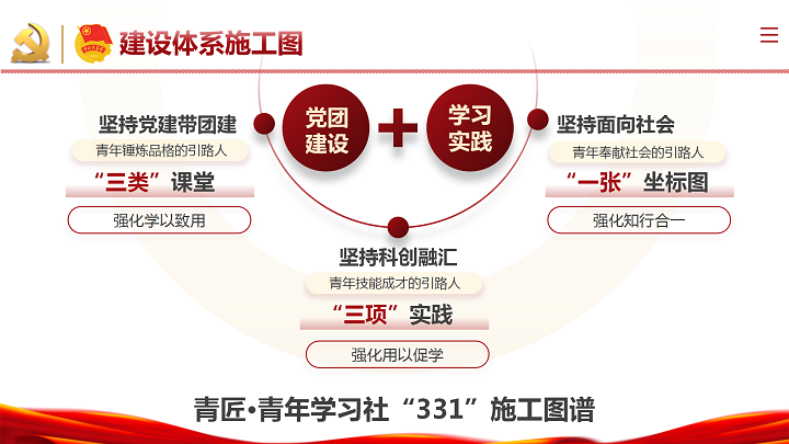 本学习社以“双心驱动”为发展理念,将科学家精神和工匠精神融入青年学习社建设全过程,实现理论宣讲、学习支持、实践拓展、就业创业、党团员发展“五大方面”的育人力量聚合,助力新时代产业技术人才培养,落实“时代新人铸魂工程”。学习社基于“三类课堂”“三项实践”“一张坐标图”,形成了坚持党建带团建,强化学以致用,坚持科创融汇、强化用以促学,坚持面向社会,强化知行合一的“党团建设+学习实践”一体化建设施工图。