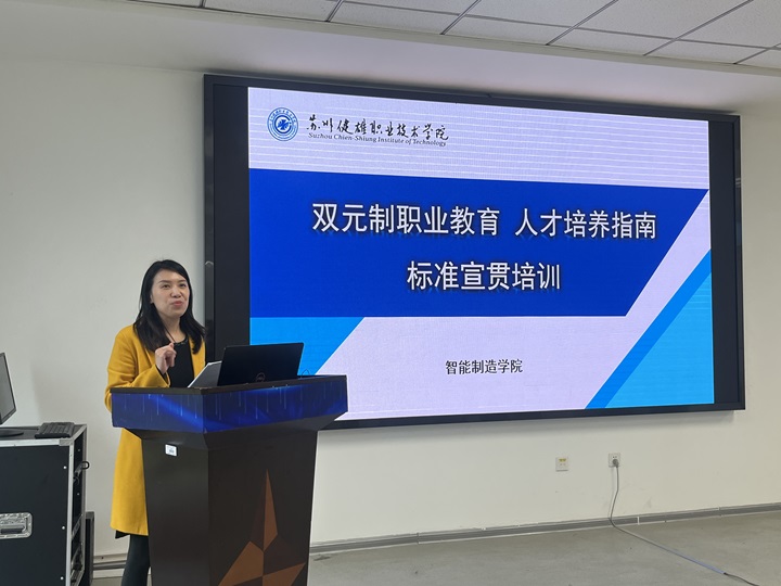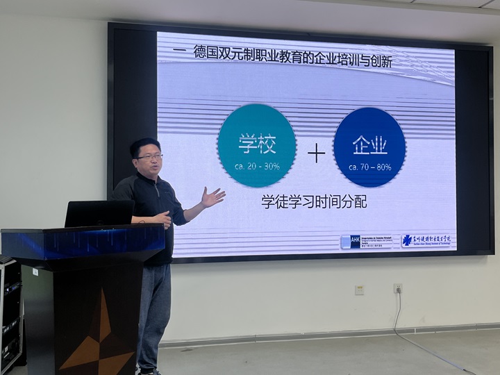 李红斌老师现场向全体教师做“双元制职业教育-人才培养指南”标准宣贯培训,围绕教育部相关的政策层面深刻解读“为什么要将双元制进行标准化”“什么是双元制标准化”的深层内涵和重要意义,并从人才培养指南、培训中心建设规范等两个标准化建设的目次内容提出对职业教育标准化建设的发展愿景。