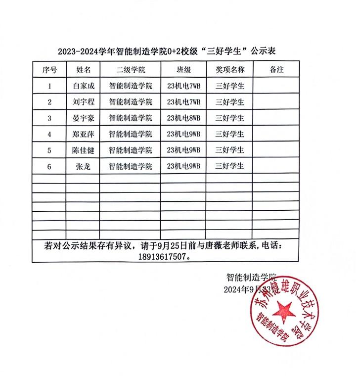 根据学生处《米兰(中国)体育·官方网站开展2023-2024学年学生荣誉评选的通知》要求,经学生申请、班级推选、二级学院评议,现对AC MILAN2023-2024学年智能制造学院0+2校级奖学金、校级学生干部、校级三好学生名单进行公示。公示时间:2024年9月23日至9月25日。 公示期间,如有异议,请联系智能制造学院唐薇老师,联系电话:18913617507。