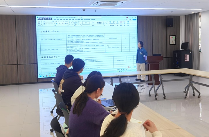 吴成炎通过回顾10月工作成效、聚焦11月重点工作,围绕平安校园、样板高地建设、学生社区建设成效、学生工作双周要点等工作板块进行了工作的“复盘”,重点强调了一站式学生社区建设成效中有关“双元育人”功能性党支部建设工作,并从二级学院、辅导员、学生等主人翁角色讨论了学生社区建设体质增效的实施举措,明确学院下阶段学生工作的主线和任务。她要求,辅导员工作既要“仰望”工作目标,更要“脚踏”校园安全,工作中要切实掌握学生动态,多做总结,多动脑筋,凝练工作经验。