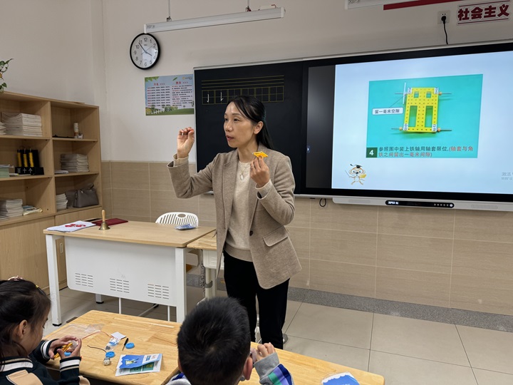 课堂上,周玲余以绿色出行、低碳生活为引入,向孩子们介绍了跑出“中国速度”的新能源汽车的工作原理。为更加直观地展示电能转化为动能的过程,她带领孩子们利用身边的调味品共同完成了盐水小车的实验。