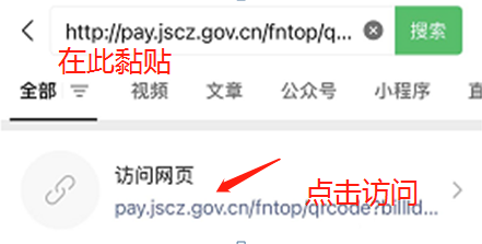 2.复制缴款码链接到微信搜索框中,点击访问网页,核对姓名、班级、金额后,完成缴费。