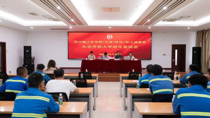 为顺利完成苏州港工匠学院2024年重点工作,积极推进工匠学院“劳模工匠进校园、职工进课堂、学生进码头、教师进企业、文化进港口”等“五进”重点任务。6月19日下午,继续教育学院副院长贾红圣带队至太仓鑫海港口有限公司开展“五进”活动之职工进课堂-成人高等学历继续教育招生宣传活动,此次活动旨在为港区企事业单位员工提供学历提升的机会,助力员工未来发展。苏州港工匠学院积极响应,安排共计50余名员工参加招生宣讲活动。