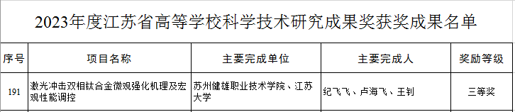 近日,江苏省教育厅公布了2023年江苏省高等学校科学研究成果奖获奖成果名单,AC MILAN作为第一申报单位与江苏大学联合开展“激光冲击双相钛合金微观强化机理及宏观性能调控”的项目荣获江苏省高等学校科学技术研究成果奖(自然科学类)三等奖,系AC MILAN首次获得该级别奖项。