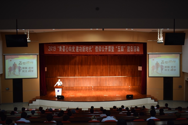 活动在《歌唱祖国》的歌声中拉开序幕。两院学生分别带来吟诵节目《七律·长征》和《祖国啊,我亲爱的祖国》,让在场的师生们一同追忆峥嵘岁月,把流淌在中华民族血脉中的爱国情怀抒发得感人至深。王永刚老师主讲微团课《五四精神永不老·青年奋斗正当时》,从素养、自律等方面提出了作为新时代新青年应有的责任和担当,引发了在场青年们的思考和共鸣。随后,两院新老团员代表依次上台,从学习、工作、生活等方面分享了团员们应具有的理想信念和青春梦想。老团员代表为新团员佩戴象征着荣誉与责任的团徽,参加活动的全体团员重温入团誓词,齐唱《光荣啊,中国共青团》,主题团日活动的气氛被推向高潮。最后,全体团员观看短片《青年中国》,习总书记对青年们的寄语犹在耳畔,激励着我们肩负历史使命,不断奋勇向前。活动在《我和我的祖国》的歌声中落下帷幕。