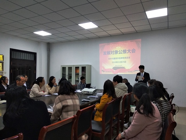 1125日中午,软件与服务外包学院发展对象公推大会在D2-303会议室顺利举行。教工支部和学生支部的23名党员同志以及付彬泉等5名2020年度发展对象候选人到场参加。学生支部书记周懋怡担任主持。
