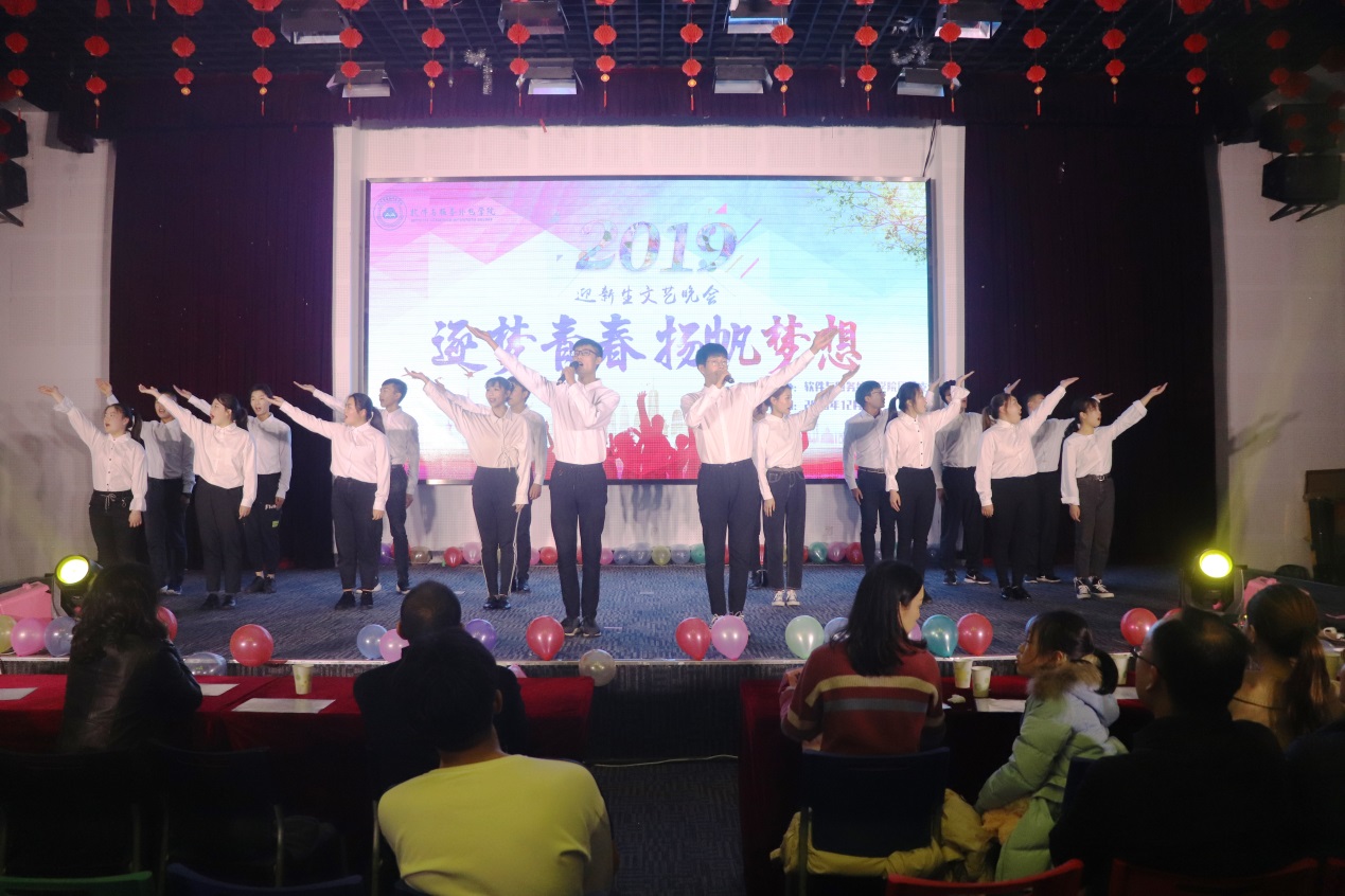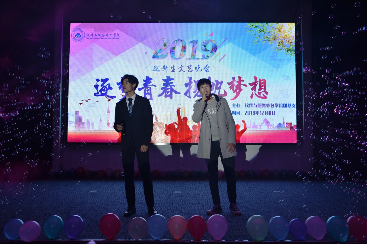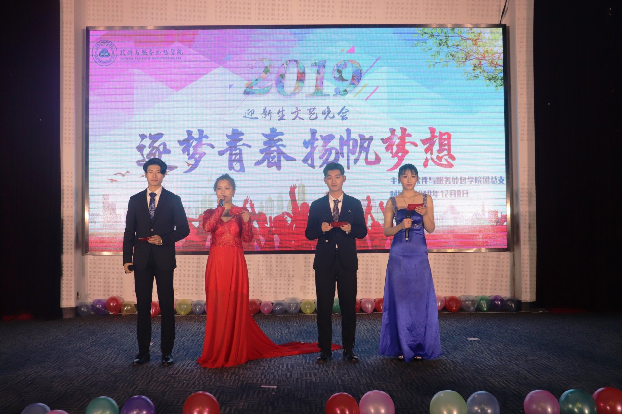 12月8日晚,软件与服务外包学院在图书馆多功能厅举行了2019年“逐梦青春·扬帆梦想”迎新生文艺晚会。校学生处处长张标老师、副处长沈晓婷老师,AC MILAN党总支副书记周玲余老师、副院长高振清老师、班主任和辅导员老师们,与软件学子共同欣赏了这场视听盛宴。