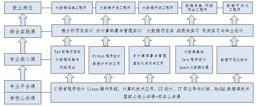 以信息技术服务外包专业群的总体框架为基础,将职业素质养成教育贯穿人才培养全过程,依据大数据行业标准和规范,围绕大数据运维、大数据分析等目标岗位群的岗位技能需求进行课程设置与内容选取,设计模块化专业课程体系。通过实施这些模块课程以及配套的实践环节可以强化学生大数据运维、数据预处理和分析应用能力,从而紧跟行业发展新技术,提高人才培养质量,为学生可持续发展提供保证。
