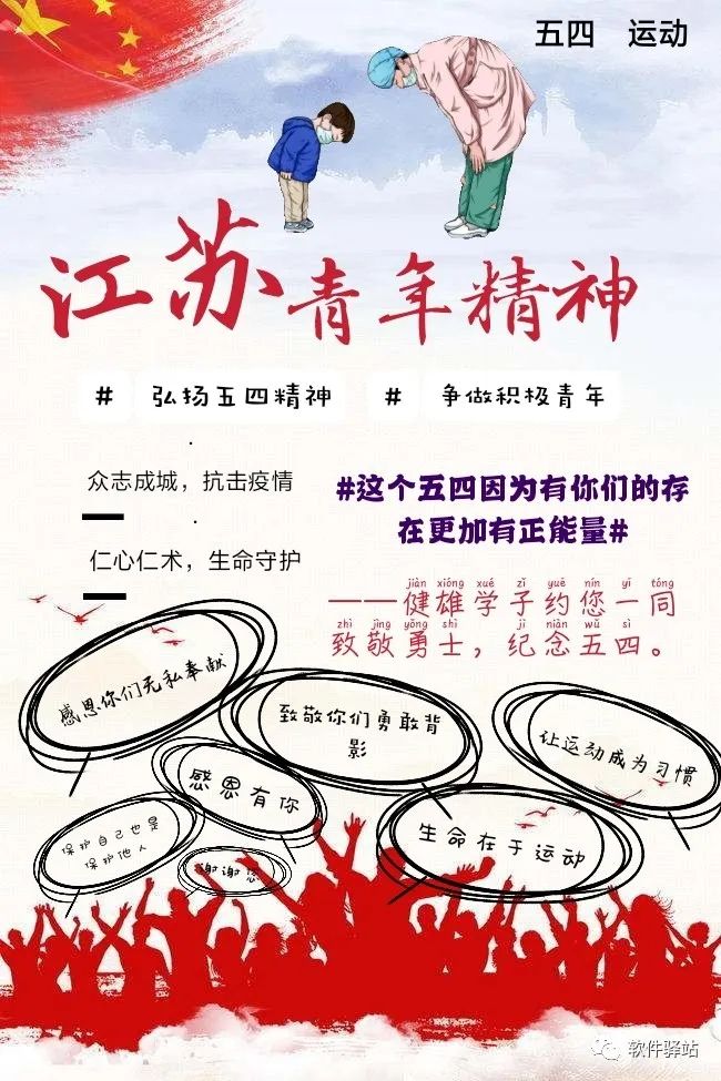 我们是江苏青年,江苏青年也与众多青年一样,有着五四精神中的爱国精神。面对疫情的到来,我们不抛弃不放弃,对那些患病的亲人朋友们,我们怀揣着希望,期盼着他们的康复,在他们触手可及的地方陪伴着。我们可以为了既定的目标不懈努力,思维扩散,用我们积极创新的精神探讨出各种行之有效的方案,解决疫情期间的系列困难。