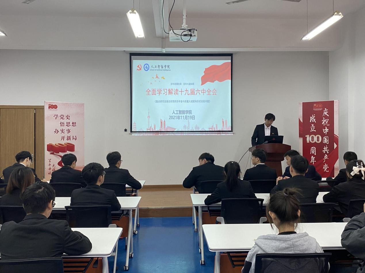 11月19日,人工智能学院团总支在D1-207教室开展了学习党的十九届六中全会精神会议,学院团学干部以及入党积极分子到场参加。会议由中共预备党员杨磊主持。