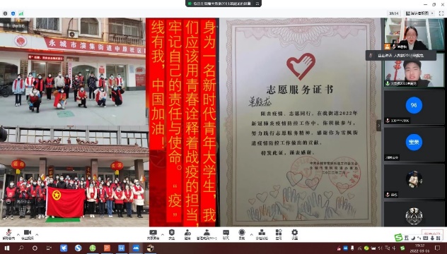 为充分展现我校学子积极参与疫情防控的事迹,弘扬疫情防控好榜样精神,活动中,本次寒假参与防疫志愿工作的学生也就其亲身经历进行了分享。软件2101马高照、移动2001朱磊昌、电子2061金宇宸等同学通过动人故事和感受体会,以话语鼓舞士气、以照片振奋精神。辅导员周懋怡、杨诗怡也就本次参与太仓市两轮核酸检测的志愿经历进行了分享。
