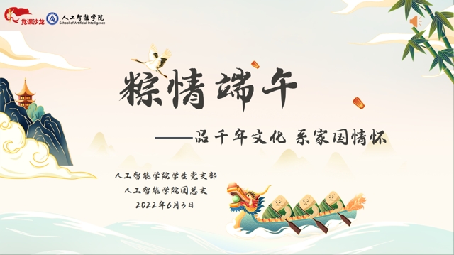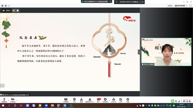 6月3日下午,人工智能学院学生党支部第九期党课沙龙(端午特别版)在腾讯会议平台举行,主题为《粽情端午——品千年文化 系家国情怀》。入党积极分子、入团积极分子以及各班同学共计270余人,在线上度过了一个特别的端午节。本期主持人为软件2112团支书徐琦。