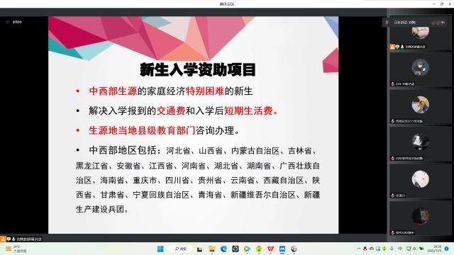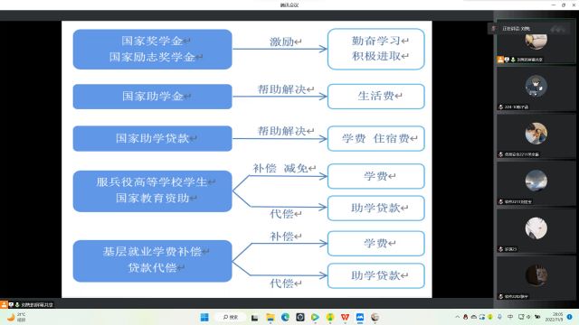 11月9日晚,辅导员杨诗怡、刘隽老师向2022级新生开展了《国家资助,助你飞翔》主题讲座,对国家奖学金、国家励志奖学金、国家助学金、国家助学贷款、服兵役高等学校学生国家教育资助等资助政策进行了介绍。接着,两位老师讲解了各类资助项目的相关政策和申请条件,帮助同学们对学生资助工作体系有了更全面的了解。同时,提醒同学们预防电信诈骗,擦亮眼睛,提高警惕,抵住诱惑,避免上当。