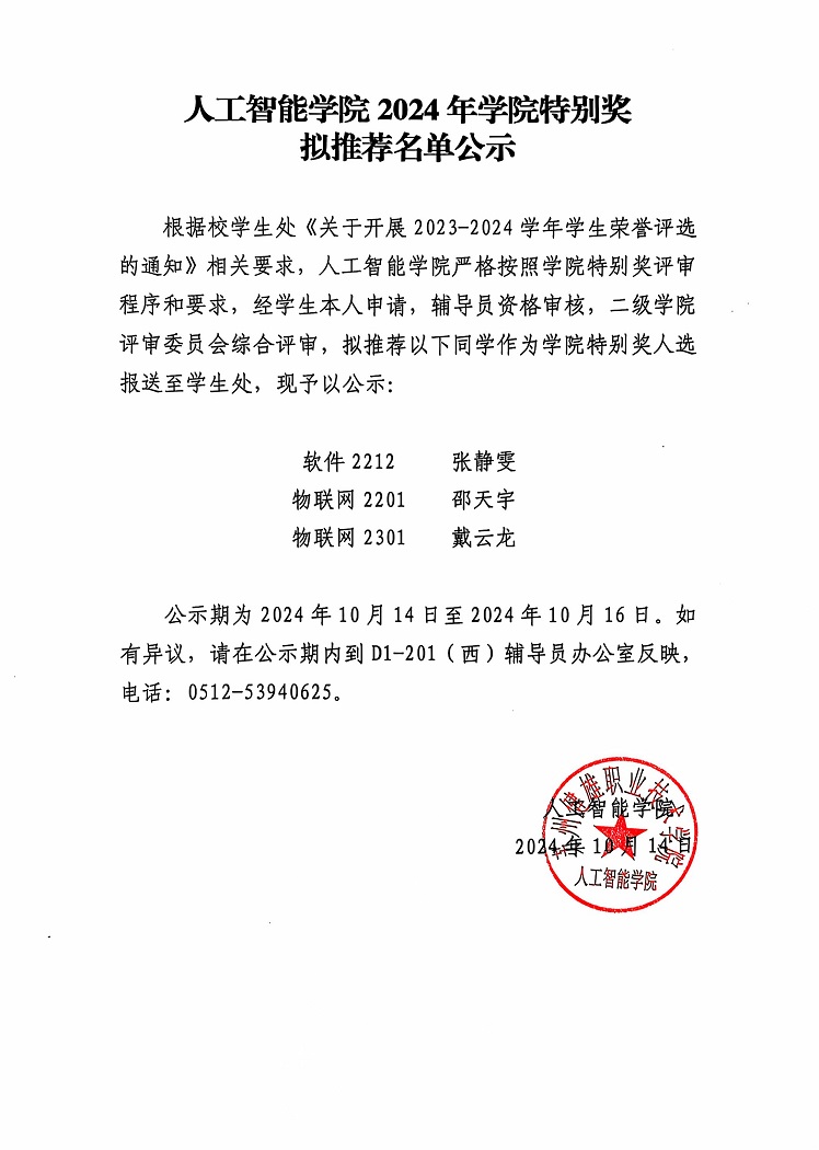 人工智能学院2024年学院特别奖拟推荐名单公示