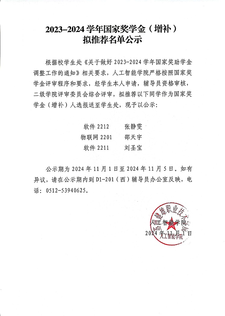 人工智能学院2023-2024学年国家奖学金(增补)拟推荐名单公示