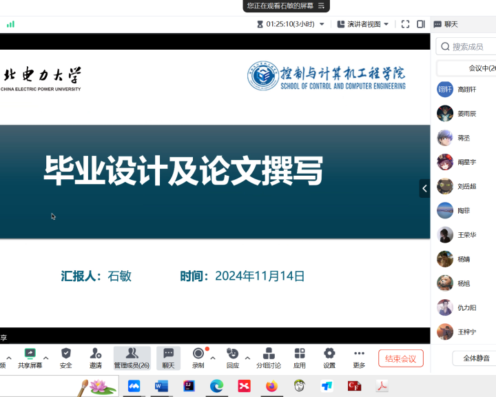 石教授首先强调毕业设计对学生学术与综合能力的检验作用,随后建议从兴趣与专业结合出发,选取创新且可行的课题。她分享了文献检索技巧,鼓励广泛阅读以夯实研究基础。在制定研究计划时,石教授指出需明确研究目标、内容、方法及时间表,确保计划切实可行,并介绍了实验法、调查法等常用研究方法。论文写作方面,她着重讲解了论文结构、规范与表达,强调逻辑性和条理性,最后她还展示了历年优秀毕业设计作品,供学生们学习借鉴。