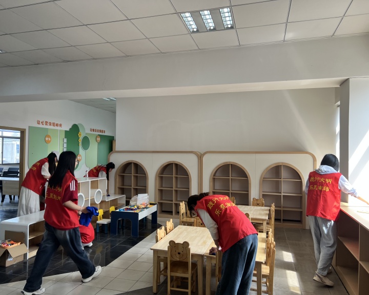 在社区养老中心,学生志愿者们对房间的地面、桌椅等进行全面清扫和整理以耐心细致和努力为老人们提供一个清新整洁的生活环境。