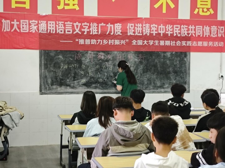 “四是四,十是十……”清脆响亮的绕口令在教室里此起彼伏,孩子们兴致勃勃地跟着志愿者一遍遍练习。实践团队设计了系统有趣的推普环节:从基础的拼音发音技巧,到常见的推普小知识讲解;从紧张有趣的绕口令比拼,到创意十足的“一句话接龙”游戏。孩子们在轻松愉快的氛围中踊跃参与,普通话水平悄然提升。这种寓教于乐的方式,不仅锻炼了他们的语言表达能力,更极大地激发了他们学习普通话的热情和自信心。