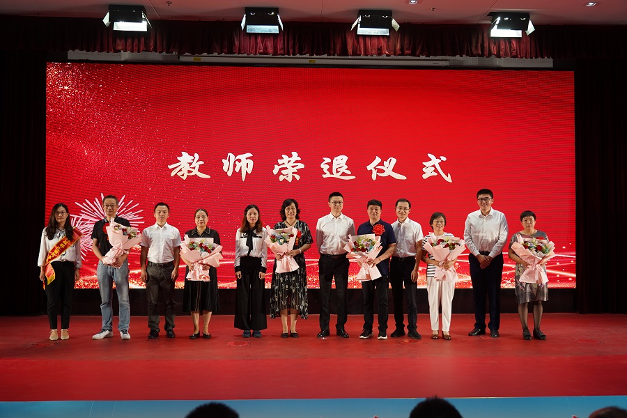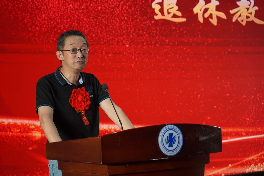新进博士向退休教师献花。退休教师代表郑勇发言。
