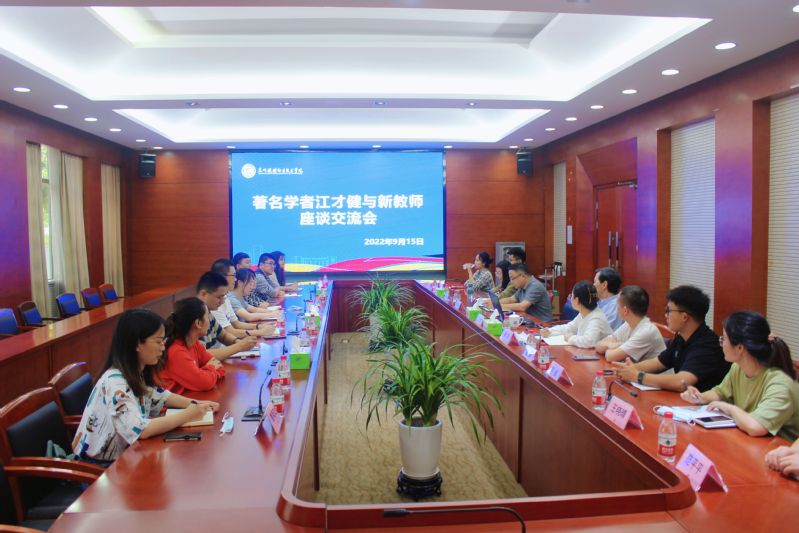 在互动环节,5位新教师进行提问交流。会后,江才健先生和新教师一起合影留念。(图文/陈刚,审核/周琪玮)