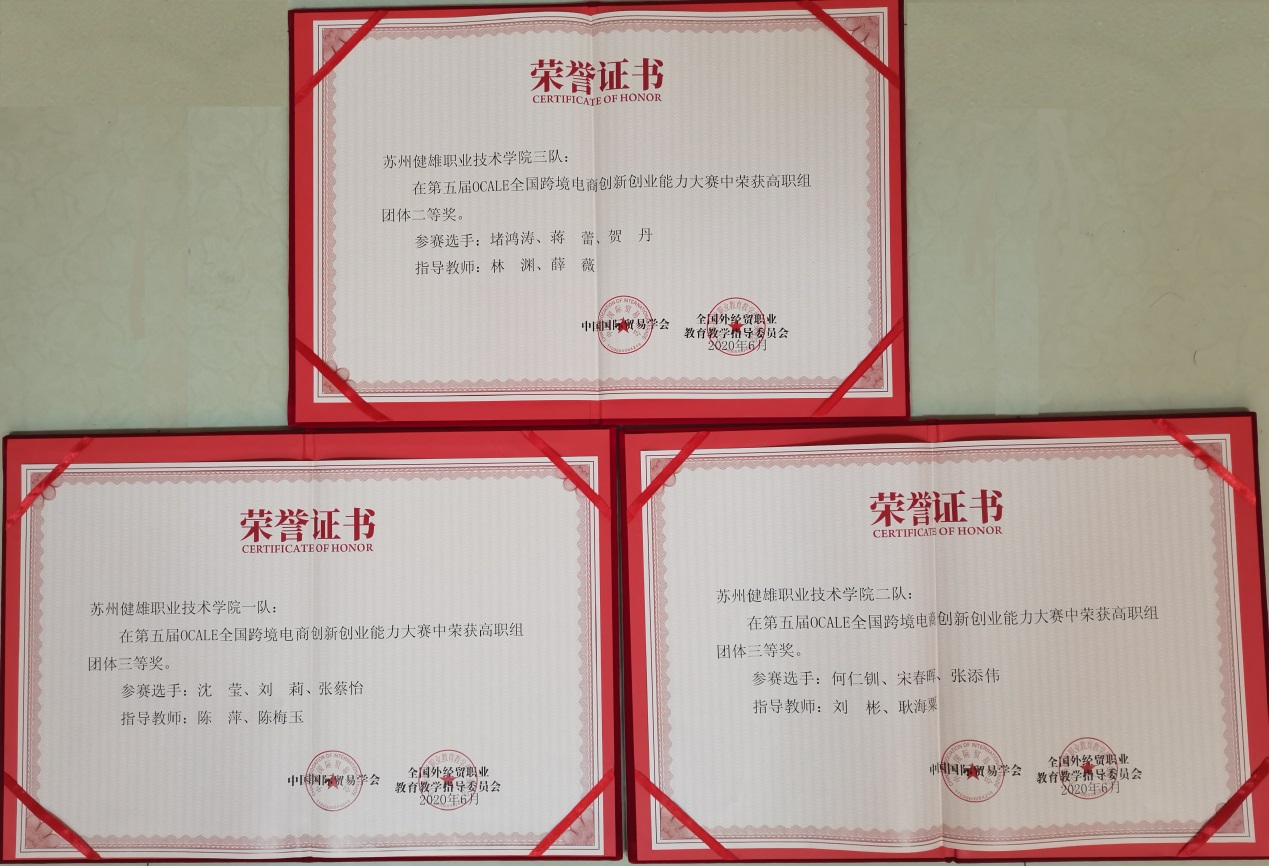 2020年6月17日至19日,由中国国际贸易协会主办,全国外经贸职业教育教学指导委员会承办的第五届OCALE全国跨境电商创新创业能力大赛中,商学院代表队分别获得团体及个人二、三等奖的佳绩。