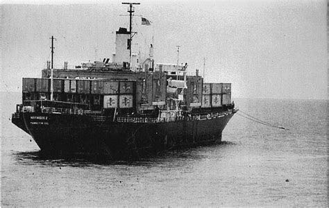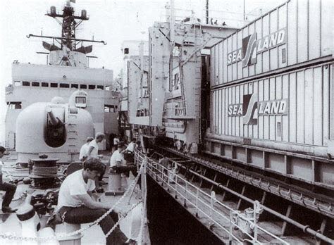 马亚克斯号事件:1975年5月12日海陆公司的SSMayaguez号在前往暹罗湾的路上遭柬埔寨红色高棉政权绑架。在收到船员发出的求救信号后,美军迅速展开营救行动。经过一番激战,护卫舰霍尔特号成功解救SSMayaguez号。照片上清晰的看到了折叠的基斯吊车和轨道。