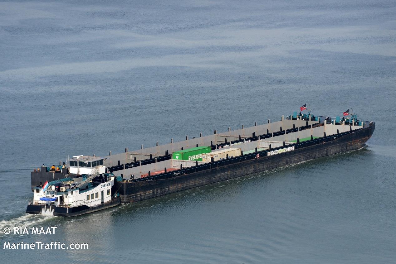 这艘驳船叫CORVUS号,常见于欧洲地区。它延续了FIXUT MARIS号的可升降驾驶台,在内河运输时候的安全性以及通过性也是极其优秀。它与FIXUT MARIS号最大的区别在于采用“顶推”的运输方式-其自身没有固定的船体,通过缆绳绑扎的方式,把装有集装箱的船体和它绑扎在一起,推动集装箱船体来达到运输货物的目的。这种船尾和船头可分离式运输类似于公路运输中的甩挂运输,当驳船把货物安全运送到码头之后,它可以与集装箱船体分离,再去运输下一个装有集装箱的船,大大提高了船舶运输效率。CORVUS号虽然仅长129米,宽23米。但是通过顶推,其可以推动多个船体,同时进行运输货物,这也是FIXUT MARIS号无法比拟的。