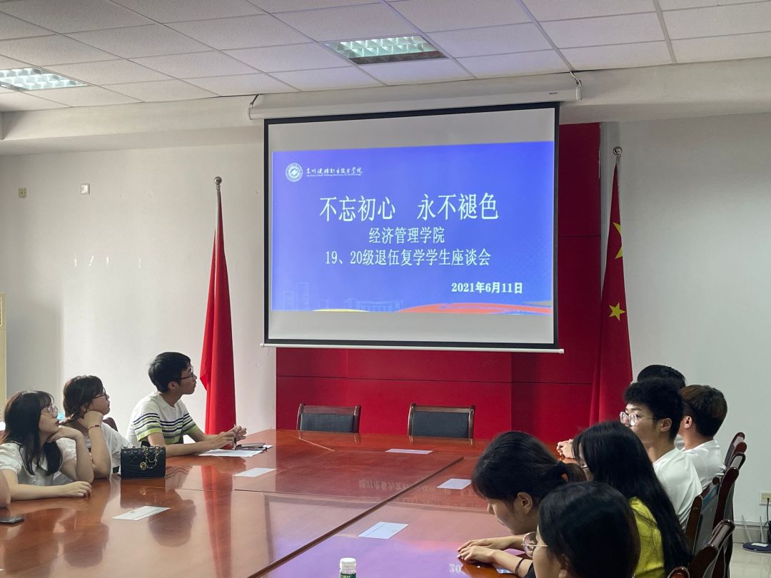 6月11日中午,经济管理学院(筹)举行了“不忘初心永不褪色”退伍复学学生座谈会,会议由经济管理学院(筹)党总支副书记周丽雅主持,负责学生安全工作的辅导员左其阳老师、19与20级18名退伍复学学生以及20级全体安全信息员参加了此次会议。