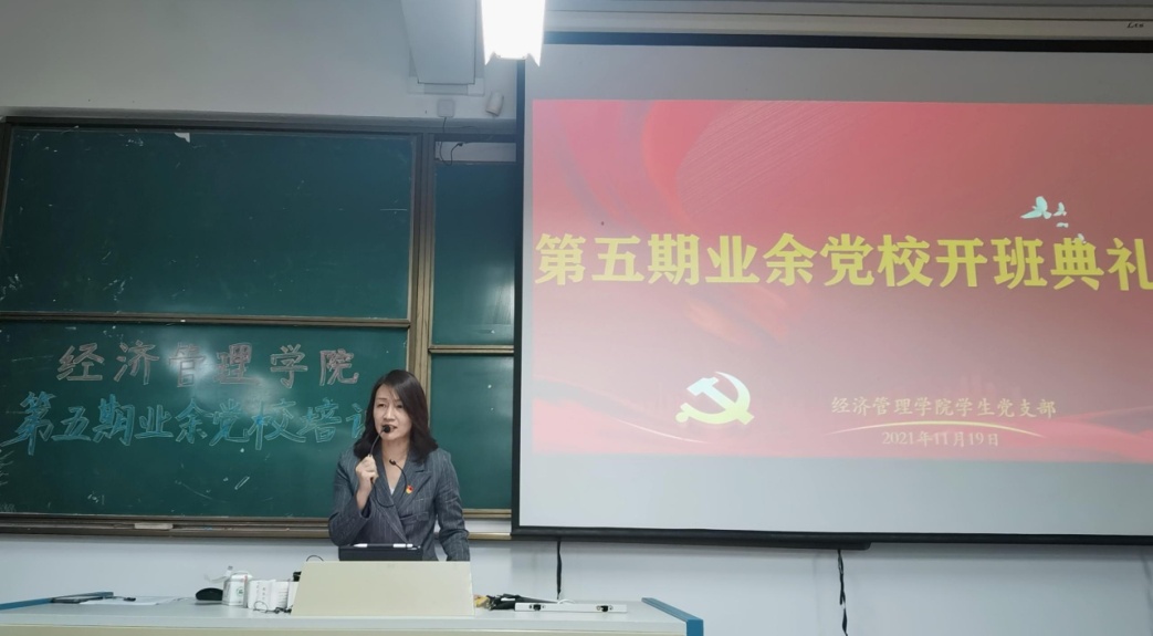 2021年11月19日晚,经管学院第五期业余党校在c3-401拉开序幕!经济管理学院党总支副书记周丽雅、学生党支部书记王超慧及105名学员参加了本次开班典礼。