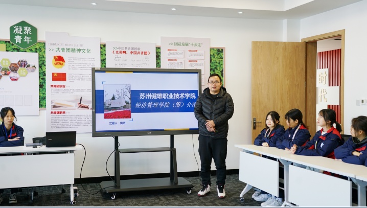 在昆山二中专,樊奇副院长给学生们介绍了学院基本情况及特色课程;市场营销专业负责人傅兰老师介绍了专业人才培养目标及课程设置;负责该专业校企合作项目的郭献山老师介绍了专业最新的一些校企合作成果。