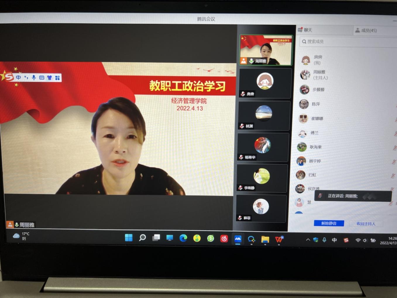 4月13日下午,经济管理学院(筹)举行2022年春学期第4次全体教职工政治学习。因疫情防控要求,学习以线上会议形式开展。本次学习活动由教职工政治学习、全体班主任会议和全体党员会议组成。