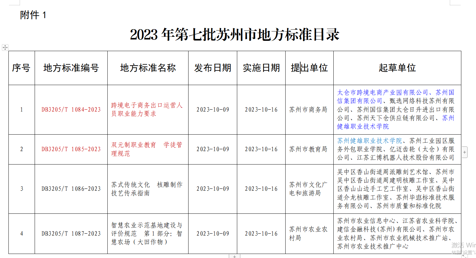 2023年,由经济管理学院侯彦博老师主持开发的苏州市地方标准《DB3205/T 1085-2023 双元制职业教育 学徒管理规范》已于10月9日由苏州市市场监督管理局正式发布,10月16日开始实施;由人工智能学院贾瑞老师主持于2022年11月立项建设的苏州市地方标准《双元制职业教育 人才培养数字化管理指南》目前已完成征求意见稿,并已将根据征求意见修改完成的技术审查稿上报苏州市市场监督管理局,正在接受技术审查。
