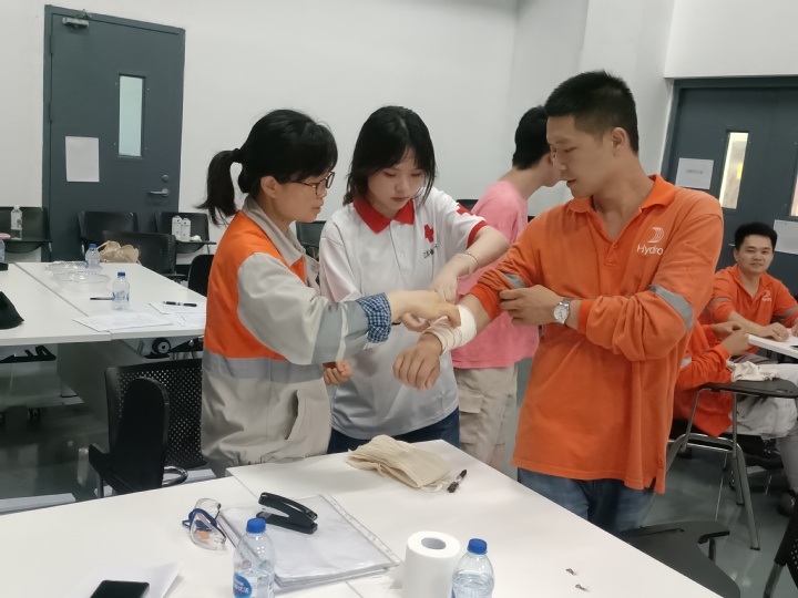 课堂上,实践团讲师还教授了伤口包扎的技巧,让员工们学会如何在第一时间有效止血、减轻伤害。工人们们纷纷表示,这些急救技能非常实用,让他们在面对意外时更加从容。这次培训不仅增强了安全意识,还让他们在面对紧急情况时更有信心和能力进行自救互救。