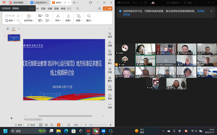 2025年3月17日,经济管理学院组织召开《双元制职业教育培训中心运行规范》地方标准征求意见线上视频研讨会,学校党委委员、副校长周晓刚、项目组全体成员、校外标准化专家参加会议,研讨会由学校标准化办公室主任苗向阳教授主持。