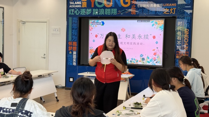 活动伊始,社区工作人员为同学们详细讲解植物拓染的原理与技巧,从植物叶片的挑选、摆放,到敲击力度与角度的把控,每一个步骤都蕴含着自然与艺术融合的智慧。