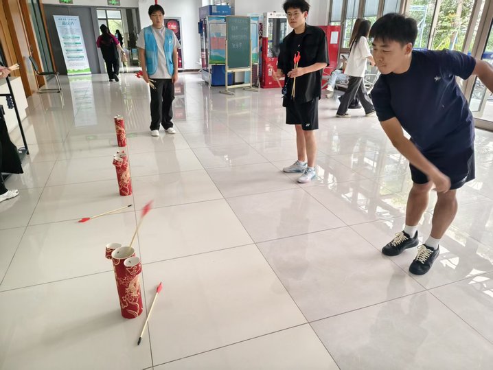 活动现场还设置了投壶游戏环节。同学们手持箭矢,瞄准壶口投掷,喝彩声与欢笑声此起彼伏。现场学生反复尝试,在游戏中感受传统礼仪的雅趣。