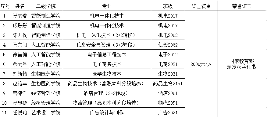 根据《教育部财政部米兰(中国)体育·官方网站印发<本专科生国家奖学金评审办法>的通知》(教财函〔2019〕105号)以及《江苏省学生资助资金管理办法》《江苏省学生资助管理实施细则》精神,经学生申请、辅导员(班主任)推荐、二级学院初审、学生工作处评审、校长办公会汇报通过后上学院党委会审定通过,拟推荐张袁瑞等11名同学申报2021-2022学年国家奖学金。现将名单予以公示,如有异议,请在公示期内与学生工作处徐老师联系。