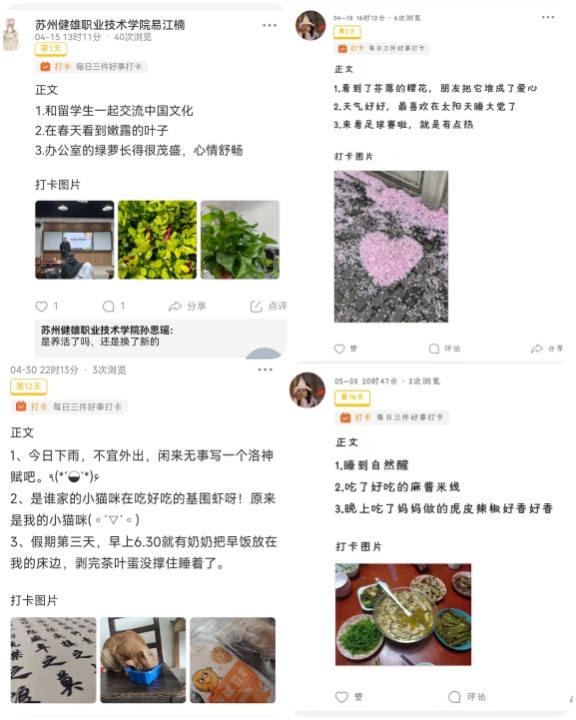 生活中不缺少幸福,只是缺少发现幸福的眼睛。在这二十一天的打卡活动中,同学们用善于发现美的眼睛,捕捉了生活中很多的小确幸。美食、美景、美意,每一个点滴都见证着对生活的热爱与追求。