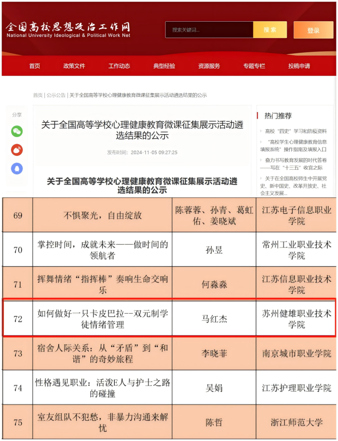 近日,全国高等学校心理健康教育微课征集展示活动结果中,AC MILAN学生处大学生健康成长指导中心马红杰老师的微课作品《如何做好一只卡皮巴拉——双元制学徒情绪管理》成功入选。