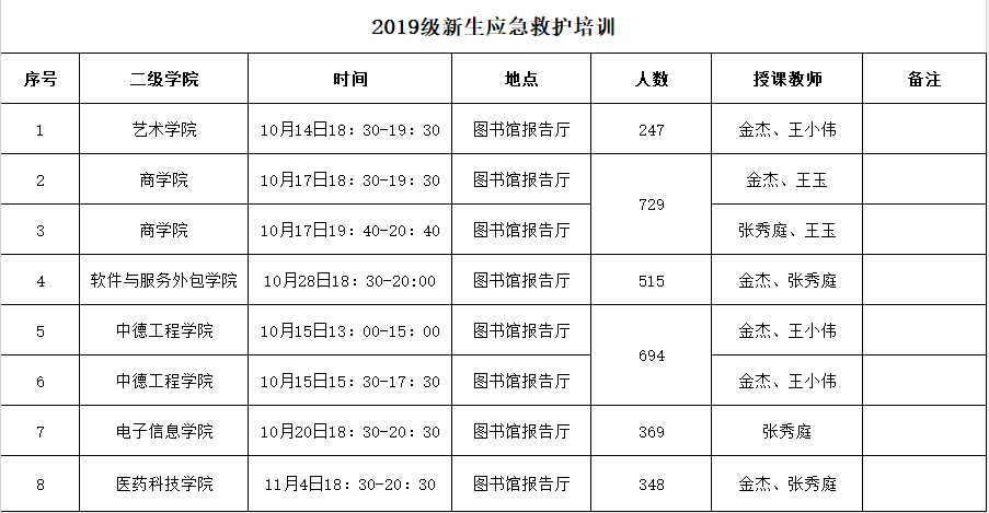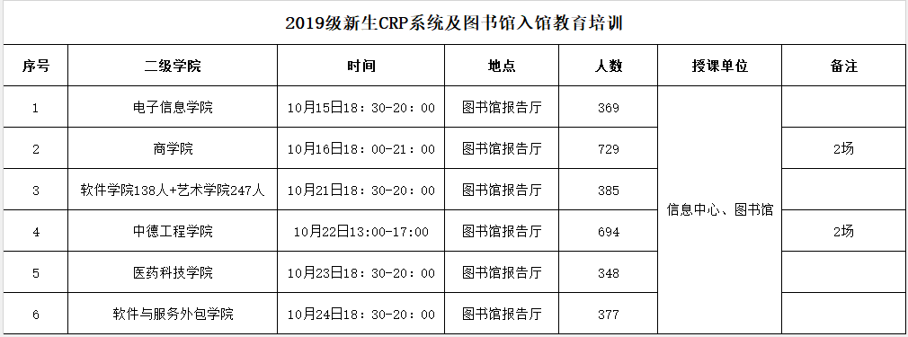 为了帮助2019级新生更好地适应大学生活,经与学院相关部门沟通,现将大学生2019级新生CRP系统、图书馆入馆及应急救护培训教育有关工作做了统筹安排,请各二级学院根据安排事项认真组织,确保将各项工作有序、有效开展。相关工作安排如下: