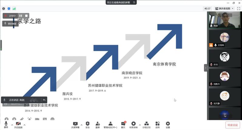本次分享会邀请到了2019届毕业生高剑和2018届毕业生郑皓仁。高剑介绍了自己从健雄出发,入伍、转本、考研的经历,他希望学弟学妹们在大学期间能从“阅己、悦己、越己”三个方面不断成长,实现自己的各阶段目标。郑皓仁一直热衷于设计行业,他讲述了自己从一名助理设计师成长为公司创始人的故事,并从专业的角度给大家指明了努力的方向。