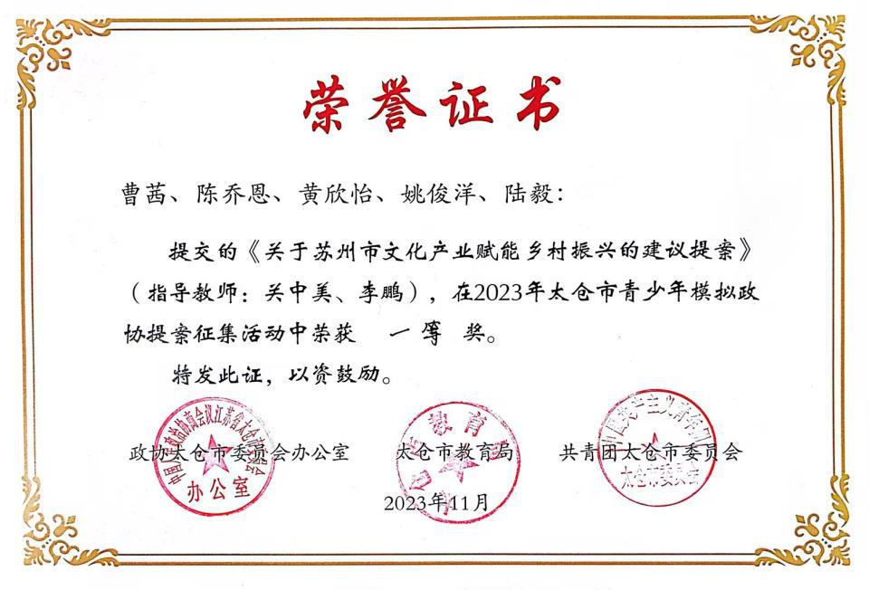 12月4日,艺术设计学院《米兰(中国)体育·官方网站苏州市文化产业赋能乡村振兴的建议提案》经现场展示决赛,从132份提案中脱颖而出,荣获2023年太仓市青少年模拟政协提案征集活动一等奖,活动由政协太仓市委办公室、太仓市教育局、共青团太仓市委员会主办。