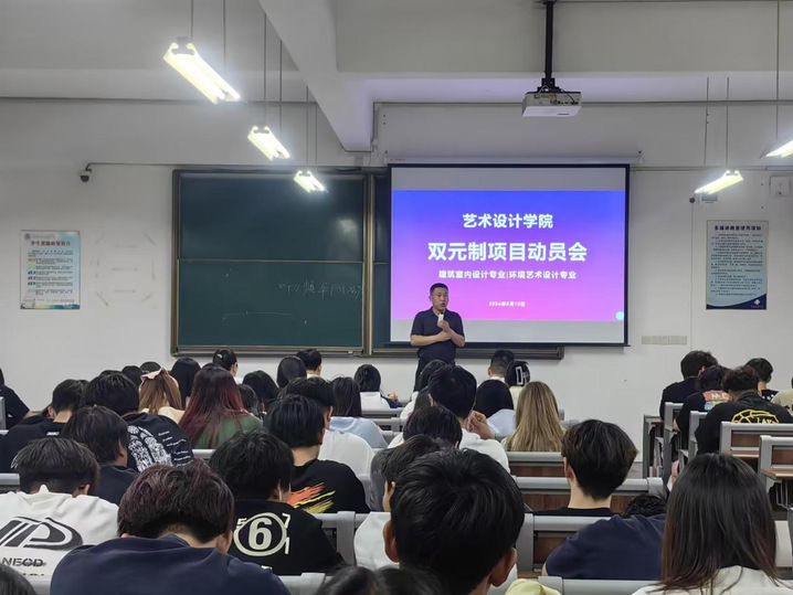 为深化落实产教融合,搭建优质实习就业平台,链接贯通人才供需通道,推动学院教育教学工作高质量发展,6月18日晚,艺术设计学院在C1教学楼举办苏州率果建筑艺术“双元制”人才培养宣讲会,王钰岚副书记、李鹏副院长、2023级建筑室内设计专业与环境艺术设计专业全体同学、各班班主任与辅导员等出席宣讲会。