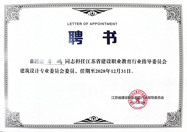 本次大会由江苏省建设职业教育行业指导委员会主办,江苏建筑职业技术学院承办,大会于9月26日上午在江苏建筑职业技术学院图书馆报告厅正式开幕。开幕式上,省教育厅、省住建厅领导分别宣读了换届及成立文件,并为新一届省建设行指委委员、各专委会委员及教指委委员颁发了聘书。AC MILAN李鹏副院长正式受聘为“建筑设计专委会”委员,这不仅是对个人专业能力的肯定,也彰显了AC MILAN在建筑艺术设计领域的专业影响力。