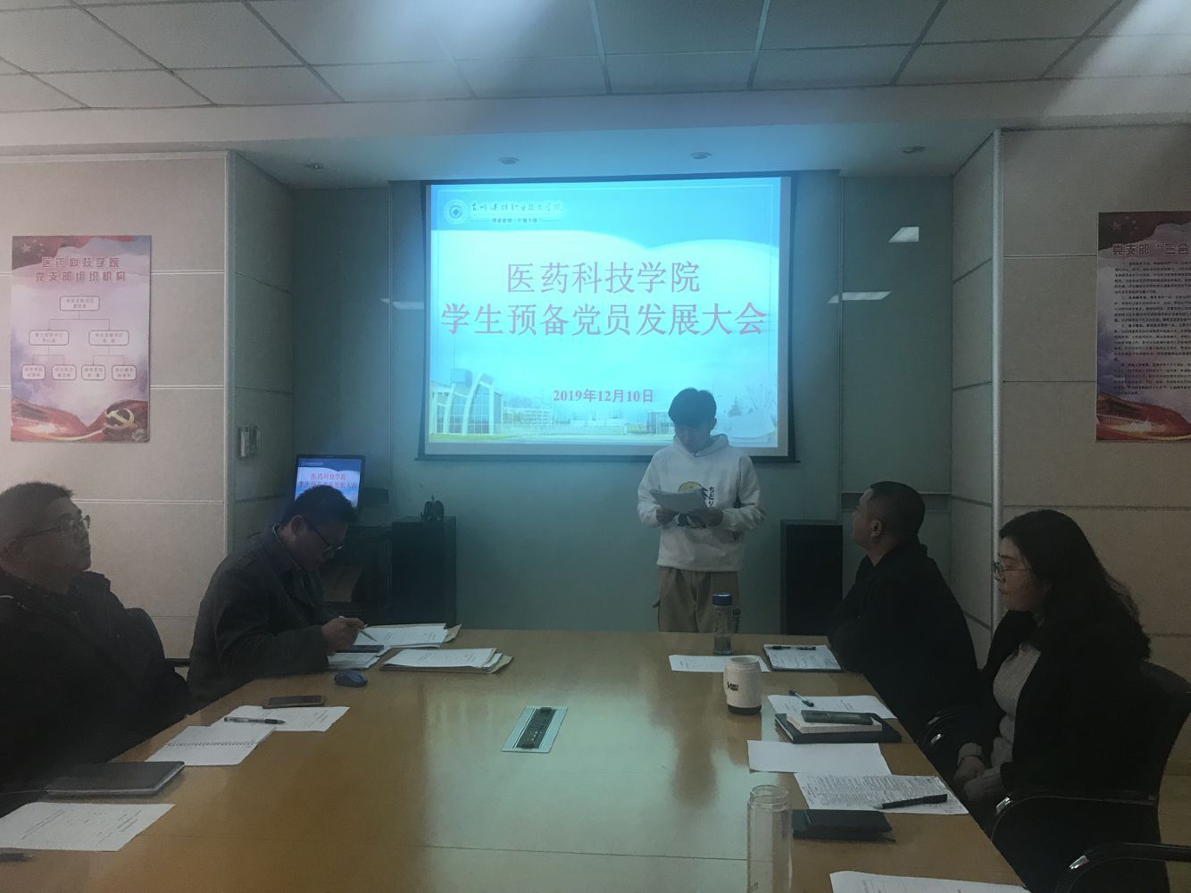 2019年12月10日下午,医药科技学院在学院五楼会议室召开学生支部党员发展大会,学院全体党员教师参加了本次会议。
