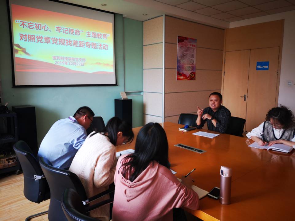 10月22日下午,医药科技学院党支部开展“不忘初心、牢记使命”主题教育——对照党章党规找差距专题活动,会议由贾红圣副书记主持。