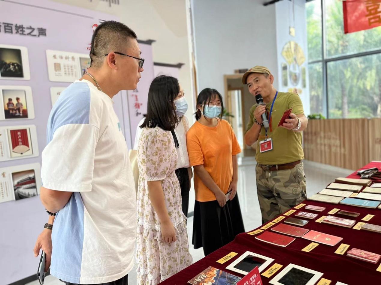 段威同志受邀担任了此次展览的讲解员,以国旗作为此次展览活动的开端,他先是讲述了国旗的由来和历史,接着向党员同志们展示了他收藏的一些书籍,中国共产党章程、共产党员宣言……,一本本书籍都记载着伟大的中国共产党发展的历程,是历史的见证者。最后党员们也了解并触摸了一些被保存下来的富有历史感的收藏品,触摸让人仿佛进入了那个战火纷飞的年代,和当时的青年“战士们”一起宣传着五四精神,在十大将军带领下在战场上挥洒着青春的热血。